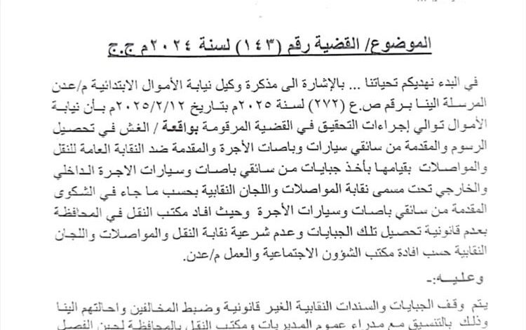وجه رئيس نيابة الاموال العامة محافظة عدن اليوم الاربعاء ١٢ فبراير ٢٠٢٥م مذكرة لمدير عام شرطة عدن بأيقاف الجبايات والسندات النقابية في جميع مديريات عدن وضبط المخالفين للتوجيهات.