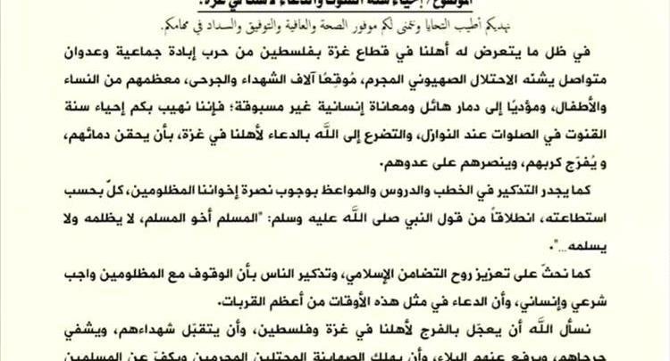 وجاء في التعميم: “المسلم أخو المسلم لا يظلمه ولا يسلمه”، مؤكدًا أن الوقوف مع المظلومين واجب شرعي وإنساني.