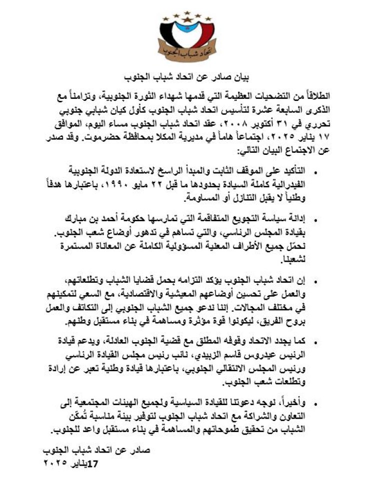 انطلاقاً من التضحيات العظيمة التي قدمها شهداء الثورة الجنوبية، وتزامناً مع الذكرى السابعة عشرة لتأسيس اتحاد شباب الجنوب كأول كيان شبابي جنوبي تحرري في 31 أكتوبر 2008، عقد اتحاد شباب الجنوب مساء اليوم، الموافق 17 يناير 2025، اجتماعاً هاماً في مديرية المكلا بمحافظة حضرموت. وقد صدر عن الاجتماع البيان التالي: